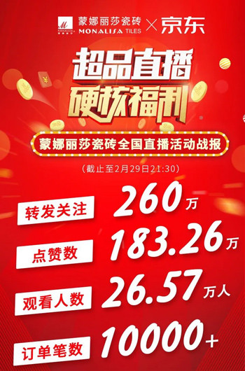 在四年一遇的2月29日,蒙娜麗莎瓷磚京東直播間里掀起了一場品牌與消費者之間的狂歡。19:30,蒙娜麗莎瓷磚聯(lián)動全國經(jīng)銷商,在京東平臺舉行了一場主題為“超品直播,硬核福利”的直播活動,資深家居人直播教學(xué)、超優(yōu)惠政策套餐秒殺,更送出了華為mate 30等超級大獎。
