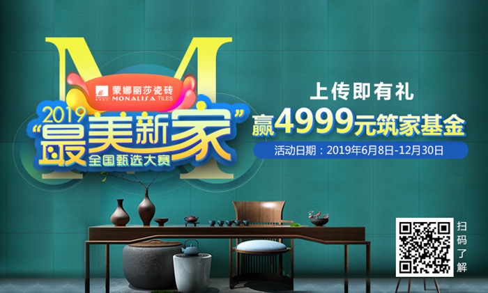 關(guān)注蒙娜麗莎集團公眾號(ID:monalisa668),點擊參與曬新家活動,上傳設(shè)計效果圖和蒙娜麗莎瓷磚產(chǎn)品裝修實景圖,參與全國范圍評選100戶最美新家活動,參與即有獎,獲選更可贏取298元瓷藝畫禮品和4999元的現(xiàn)金大獎!