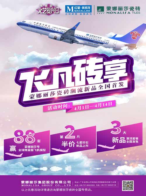 本次蒙娜麗莎瓷磚超級品牌日“飛凡磚享”活動時間:4月1日至4月14日,歡迎關(guān)注蒙娜麗莎集團(tuán)公眾號(monalisa668)了解以下活動優(yōu)惠: