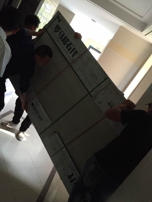 這么超大規(guī)格的陶瓷厚板,其送貨、安裝的過(guò)程也值得大書特書。4月2日,蒙娜麗莎瓷磚蕪湖銷區(qū)員工對(duì)這一天印象深刻,因?yàn)榈谝淮螌⒊笠?guī)格產(chǎn)品送貨安裝,品牌部所有的男員工都到了現(xiàn)場(chǎng),還提前準(zhǔn)備了吸盤、切割機(jī)、打包帶、大理石膠等工具和材料。送貨之前,為避免磕碰和繃瓷,物流部規(guī)劃用廢舊木工板打底,固定單片大板的方法,以確保大板完整無(wú)缺的送達(dá)。