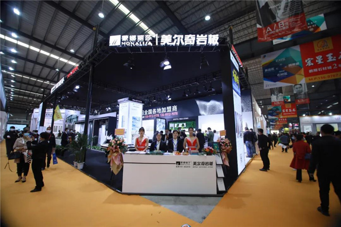 本屆石博會(huì),蒙娜麗莎-綠屋建科強(qiáng)勢(shì)入駐水頭石材產(chǎn)業(yè)展示中心,并且拿下最中央位置(A14展位)220㎡的大展位,全面展示美爾奇巖板的應(yīng)用和服務(wù)能力。展會(huì)現(xiàn)場(chǎng),客商云集,1200×2400mm規(guī)格的連紋背景墻系列巖板、巖板定制廚房系統(tǒng)、巖板黑科技產(chǎn)品——3mm透光巖板,迅速搶占C位,賺足觀眾的眼球。