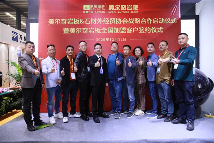 作為跨界與石材行業(yè)共融發(fā)展的陶企,蒙娜麗莎-綠屋建科在展會(huì)上正式發(fā)布“石材渠道定制巖板”——美爾奇品牌巖板,現(xiàn)場(chǎng)簽約二十多個(gè)加盟客戶,同時(shí)與石材外經(jīng)貿(mào)協(xié)會(huì)達(dá)成戰(zhàn)略合作,攜手廈門石空速配網(wǎng)絡(luò)有限公司(簡(jiǎn)稱“石空速配網(wǎng)”)開啟線上營(yíng)銷新模式。