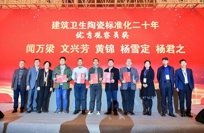今年,恰逢全國建筑衛(wèi)生陶瓷行業(yè)標(biāo)準(zhǔn)化技術(shù)委員會成立20周年,主辦方對為建筑衛(wèi)生陶瓷標(biāo)準(zhǔn)化發(fā)展做出卓越貢獻(xiàn)的個人進行頒獎。其中,蒙娜麗莎集團董事張旗康獲得“建筑衛(wèi)生陶瓷標(biāo)準(zhǔn)化二十年卓越成就獎”,蒙娜麗莎集團品管部總經(jīng)理聞萬梁獲得“建筑衛(wèi)生陶瓷標(biāo)準(zhǔn)化二十年優(yōu)秀觀察員獎”。