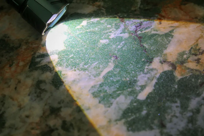 項目通過特殊的釉料配方,經(jīng)噴霧造粒后,協(xié)同數(shù)碼定位、全拋干粒釉工藝,使光線在透明釉層中發(fā)生色散,實現(xiàn)了定位多彩炫光的釉面裝飾效果,高度還原天然奢石的晶質(zhì)感和色彩飽和度。