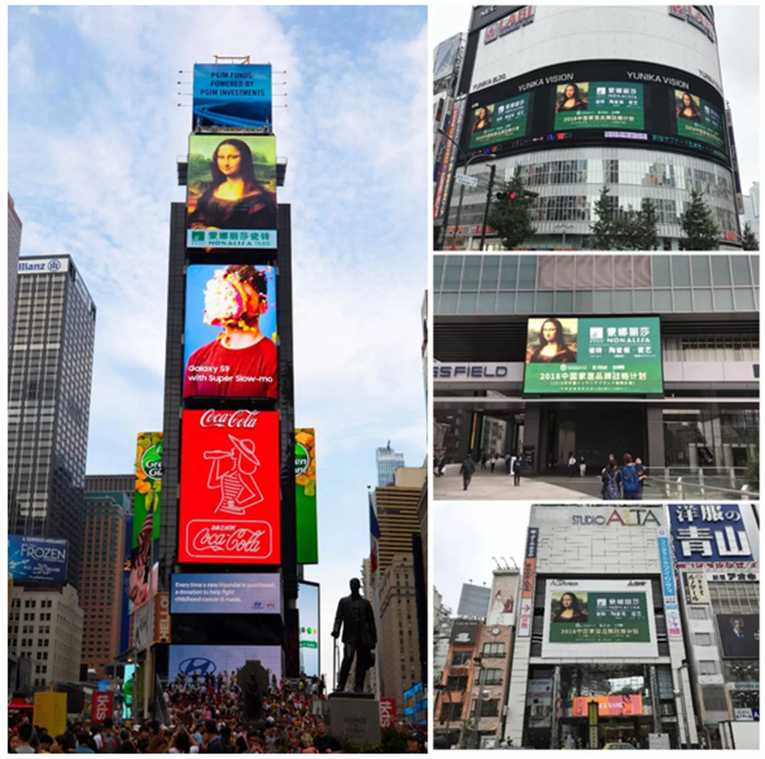 紐約時(shí)代廣場(chǎng)、東京“新宿區(qū)+秋葉原”、香港軒尼詩(shī)大道多處大屏,蒙娜麗莎通過(guò)世界各處地標(biāo)展示品牌魅力,更顯示出融入全球商業(yè)競(jìng)爭(zhēng)的積極姿態(tài)。