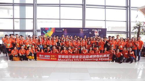 2018年8月17日,蒙娜麗莎集團帶領(lǐng)由消費者顧客、企業(yè)員工代表組成的百人“亞運助威團”,在廣州白云機場包機出發(fā)印尼雅加達,觀看第18屆亞運會開幕式,為中國健兒加油助威。