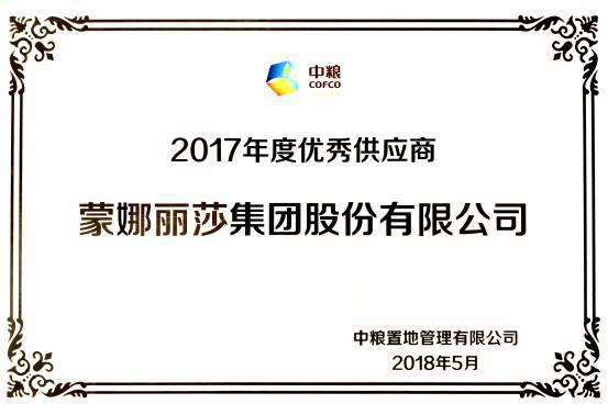 2018年5月4日,以“匠心初心·跨越發(fā)展”為主題的中糧置地2018年度供應(yīng)商大會在北京中糧集團(tuán)忠良書院召開。會上,蒙娜麗莎與中糧置地達(dá)成戰(zhàn)略合作,成為中糧置地的“集采合作伙伴”,并獲得“2017年度優(yōu)秀供應(yīng)商”。