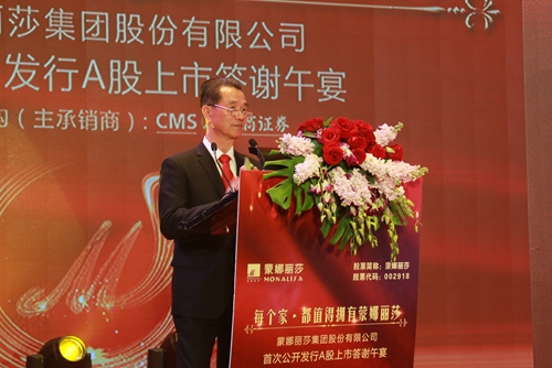 蒙娜麗莎集團董事、總裁蕭禮標在致辭中說:“蒙娜麗莎集團股份有限公司正式在深圳證券交易所上市,這是公司發(fā)展史上一個重要的里程碑。在這個莊嚴的時刻,我謹代表公司全體同仁,對各位領(lǐng)導、各位嘉賓、各位朋友的光臨并見證這一歷史性的時刻,表示熱烈的歡迎!對長期以來一直關(guān)心和幫助蒙娜麗莎發(fā)展的各級領(lǐng)導、各界友人表示衷心的感謝!對為蒙娜麗莎上市付出辛勤勞動的各中介機構(gòu)表示誠摯的謝意!”