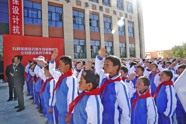 當新一天的陽光照進地處3000米高海拔新建的塔合曼鄉(xiāng)寄宿制小學,雪山下孩子們“想在新學校讀書”的心愿終于達成了。2016年9月10日,正值教師節(jié),新疆塔合曼鄉(xiāng)縣的孩子們迎來一個幸福的時刻——塔合曼鄉(xiāng)寄宿制小學交付并投入使用,解決了當?shù)睾⒆泳妥x問題。