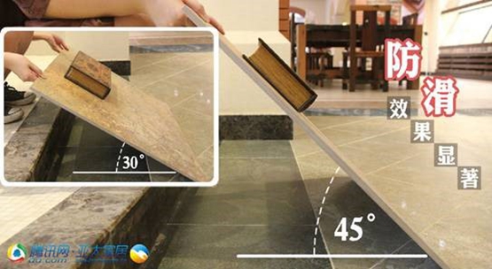 在騰訊的評測中,將一封面光滑的書置于拉菲經(jīng)典仿古磚磚面部分,并不斷傾斜角度,從10° 迅速抬到 30°,書本都紋絲不動,像釘在瓷磚表面上,直到瓷磚傾斜 45° 的時候書本仍然hold住在瓷磚表面上,止滑效果非同一般。