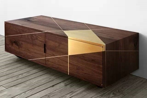 ▲寧?kù)o自然的原木板+科技感十足的香檳金,乍一看沖突,細(xì)細(xì)品味卻能激蕩出令人驚喜的美感。