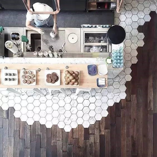 ▲用六邊形瓷磚打造的餐廳地面和背景墻,能讓平凡的空間立馬變得與眾不同。通過(guò)巧妙搭配花磚配件,使得空間更加時(shí)尚生動(dòng),更具時(shí)尚品味。