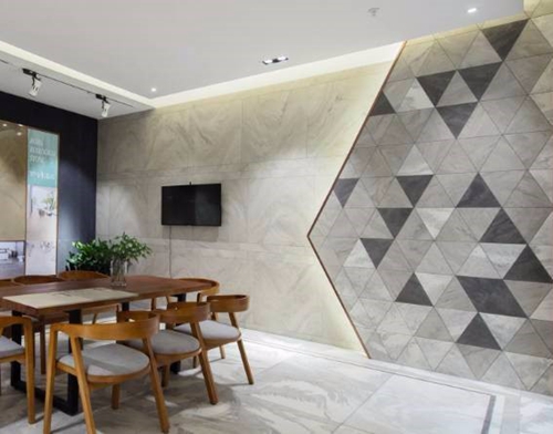 ▲羅馬御石亮光面、綢光面、自然面三種釉面混搭應(yīng)用,搭配拉絲香檳金藝術(shù)品,使得原本沉悶的背景墻一下子充滿了奇妙的視覺(jué)效果。