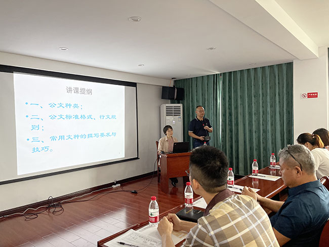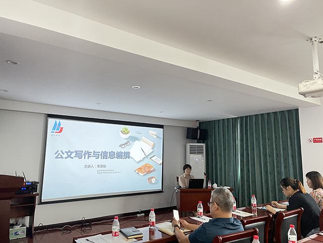 为了提升各部门公文写作和信息编撰水平,根据公司年度培训计划安排,6月19日上午,在公司十二楼会议室举行了一场“公文写作与信息编撰”专题培训。本次培训特邀金华市政协特约信息员、民盟金华市委会妇女委员会主任朱龙仙老师授课。公司本部管理人员及分公司部分管理骨干共四十余人参加了本次培训。