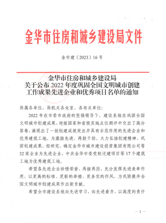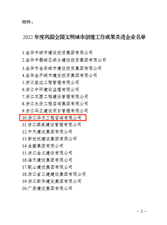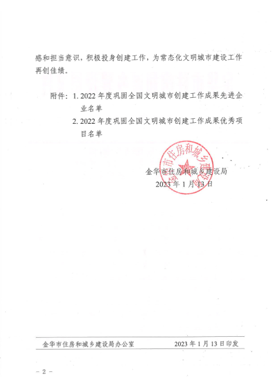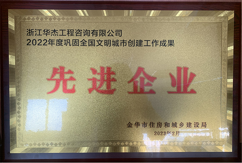 2023年3月6日下午,浙江华杰工程咨询有限公司董事长吴晓参加了金华市住房和城乡建设局举办的2022年度创建全国文明城市工作成果表彰大会,我单位获得“2022年度巩固全国文明城市创建工作成果先进单位”。