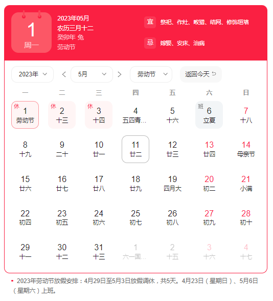 4月29日至5月3日放假调休,共5天。4月23日(星期日)、5月6日(星期六)上班。;