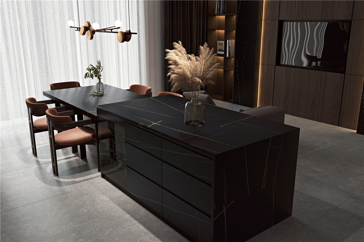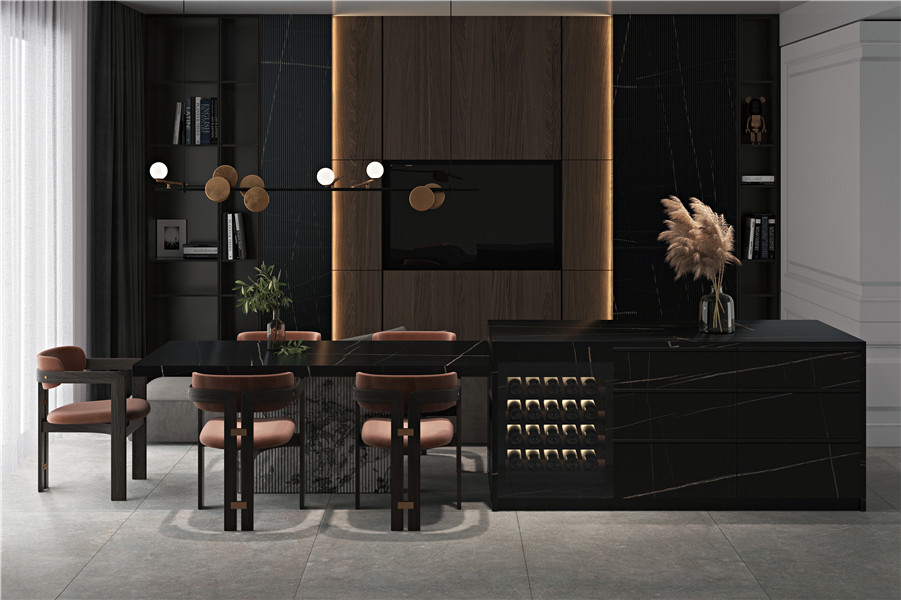 無(wú)論是家裝空間的家具、廚房、衛(wèi)浴、墻地面,還是工裝建筑的電梯、外墻、地面、前臺(tái)應(yīng)用,巖板以強(qiáng)悍的物理性能覆蓋了空間一體化應(yīng)用。同時(shí),巖板可根據(jù)裝飾需要設(shè)計(jì)多種不同表面紋理,石材面、木紋面、墻紙面、布紋面、金屬面、純色面等各式裝飾風(fēng)格,加上其卓越的功能特性可使其無(wú)縫穿插于不同空間領(lǐng)域的廣泛應(yīng)用。