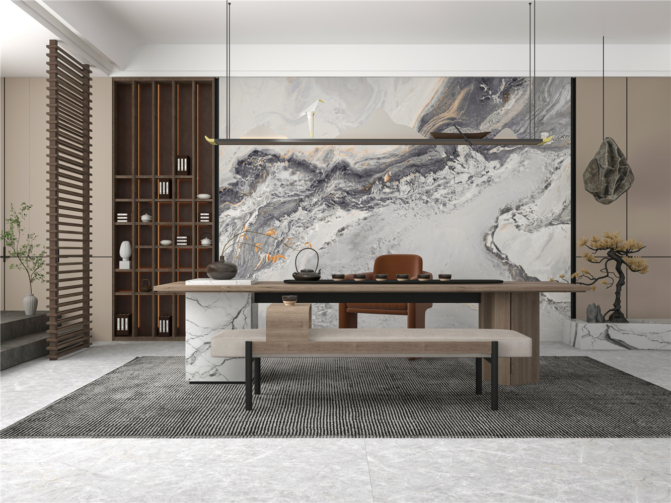 棲于大地,心歸自然。 如湖面一般伴隨色彩與肌理的延伸, 將天空漂涌的云彩、自然的滲透、光影的流動(dòng)一一還原, 放眼望去如夢(mèng)如幻。 這歸于自然、隱于山水的深遠(yuǎn)意境給人以無限想象。