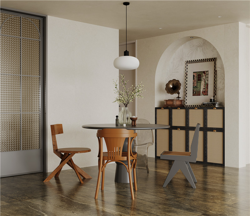 源于清晨陽光透過層層葉片,在地上投下斑駁晃動的光影。光與葉共舞,影隨光動,將這種轉(zhuǎn)瞬即逝的動態(tài)之美,轉(zhuǎn)化為可觸摸的靜態(tài)藝術(shù),鋪貼于空間,仿佛為家打開了一扇通向森林的窗。