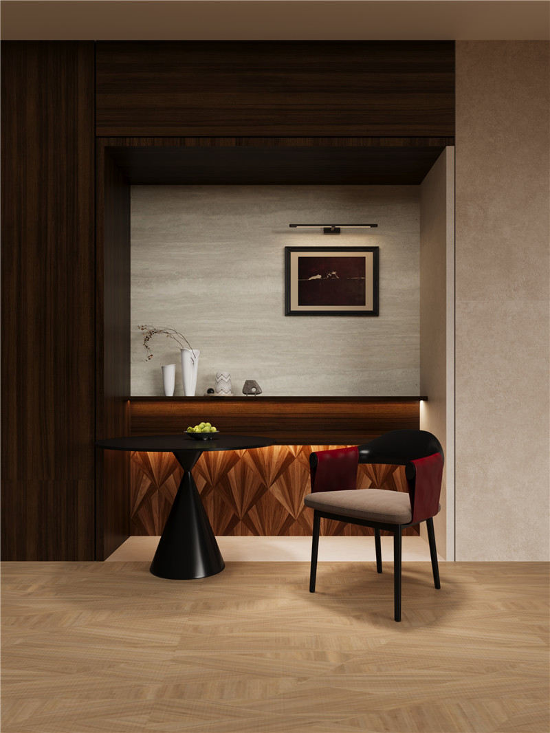 木紋藏時(shí)光,布紋蘊(yùn)溫潤,木紋的自然肌理與布紋的細(xì)膩質(zhì)感,巧妙融合其紋理呈優(yōu)雅縱向排布,色澤醇厚溫潤,既保留了實(shí)木的天然韻味,又因布紋質(zhì)感的加持,增添了一份柔和雅致的觸覺聯(lián)想。