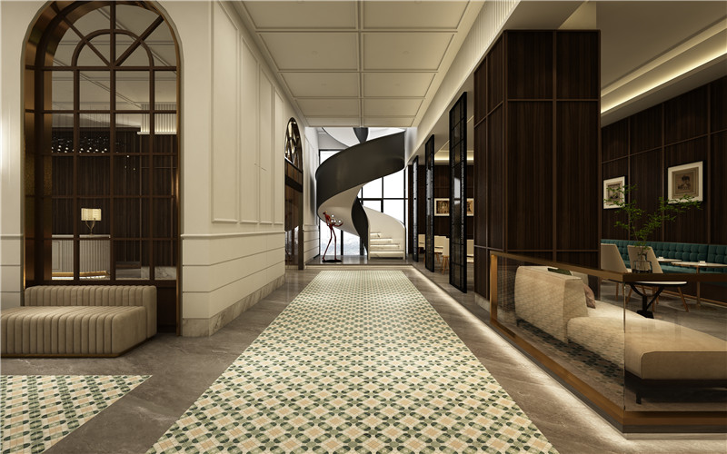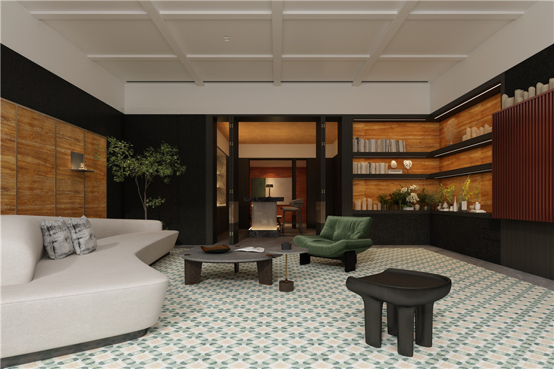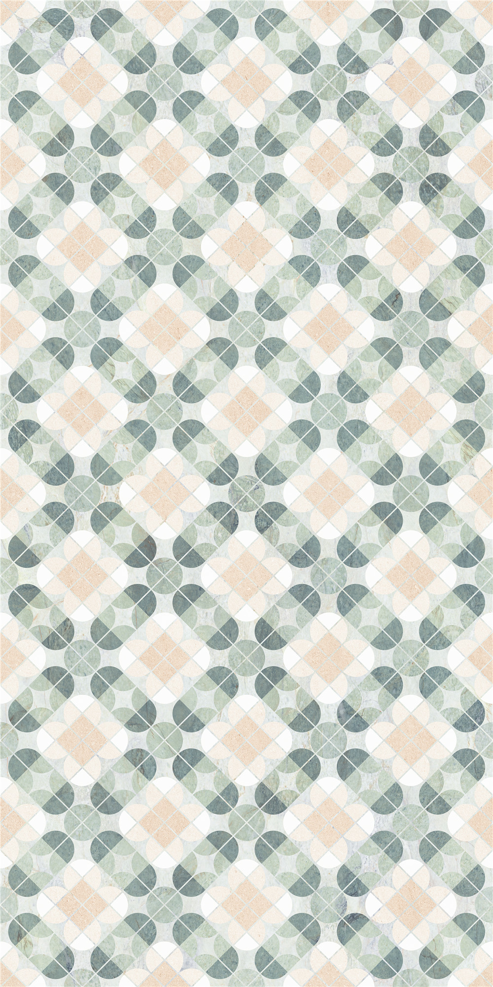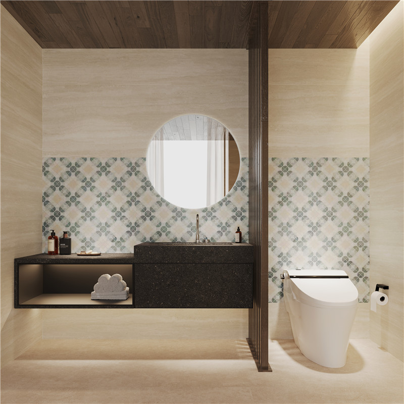 綠色石材為空間鋪陳沉穩(wěn)基底,綴以花卉柔美,再勾勒幾何規(guī)整之線。仿佛步入一片蔥郁森林,藤蔓自然舒展,枝葉對(duì)稱(chēng)生長(zhǎng),將自然與規(guī)則精準(zhǔn)拼接,讓石材成為兩者和諧交融的載體