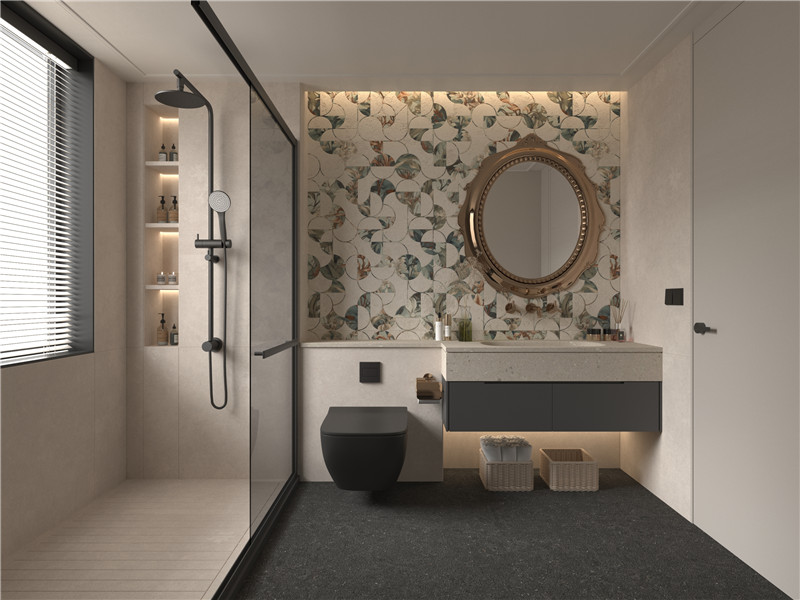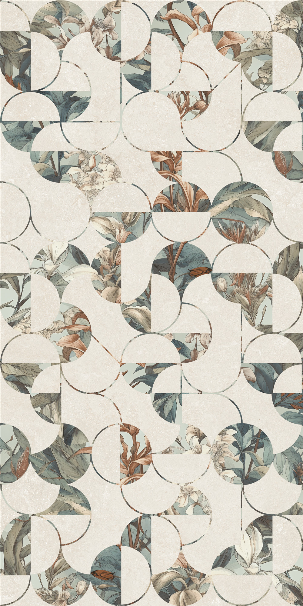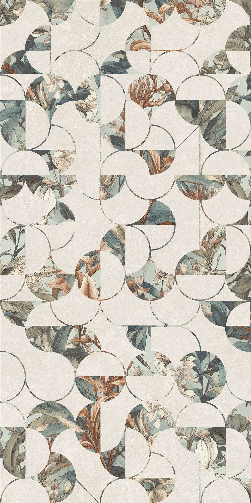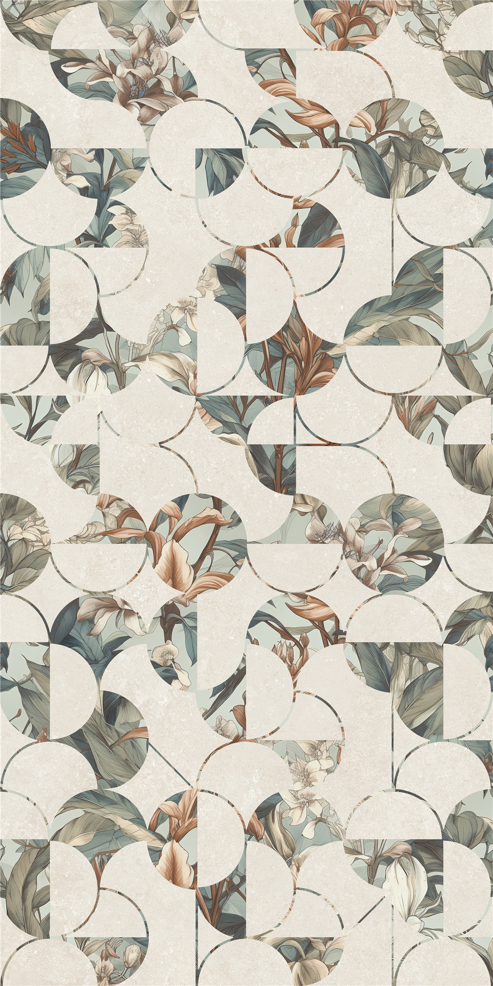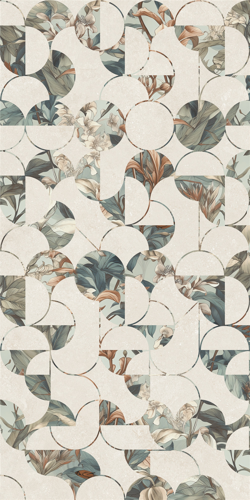 源于自然中植物與洞石的共生之美,以灰白洞石為基底,點綴墨綠或琥珀色的植物紋樣,如同陽光穿過森林灑在巖石上,既有天然石材的野性,又有拼花工藝的精致,滿足都市人群對自然棲居的向往