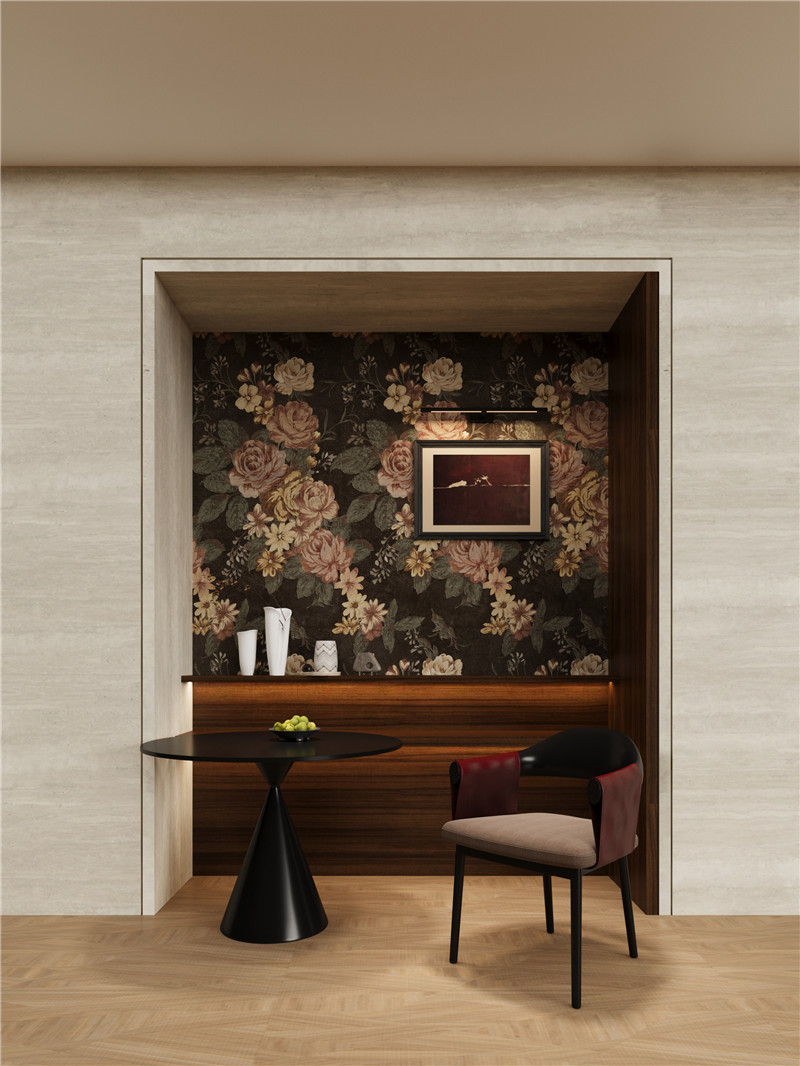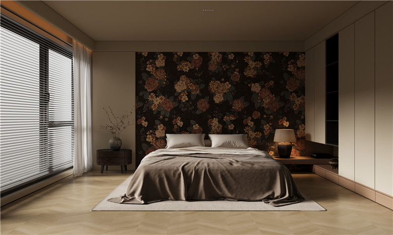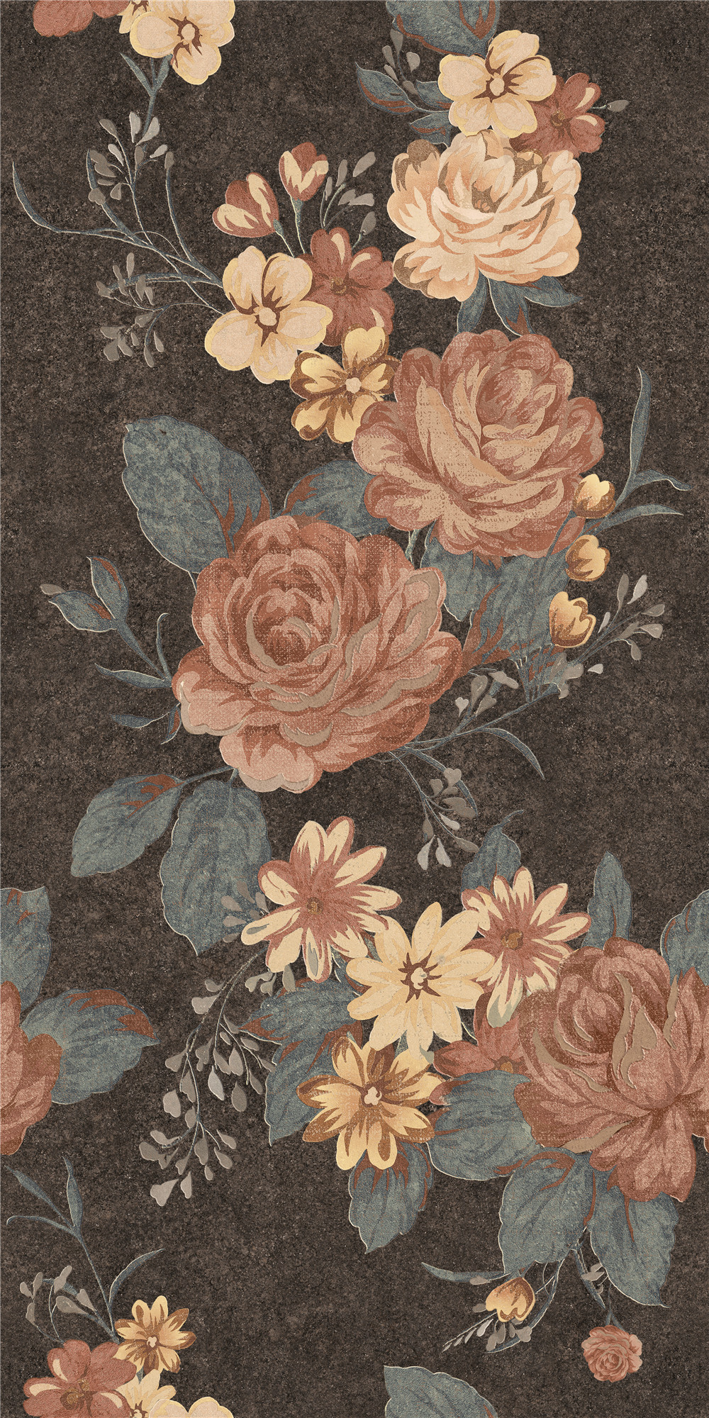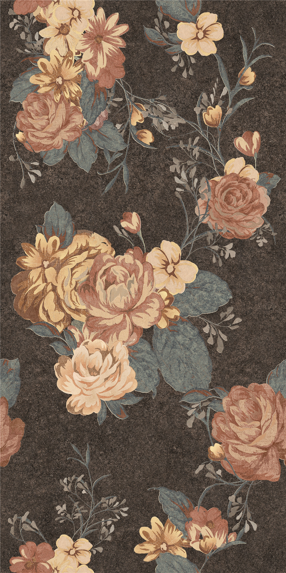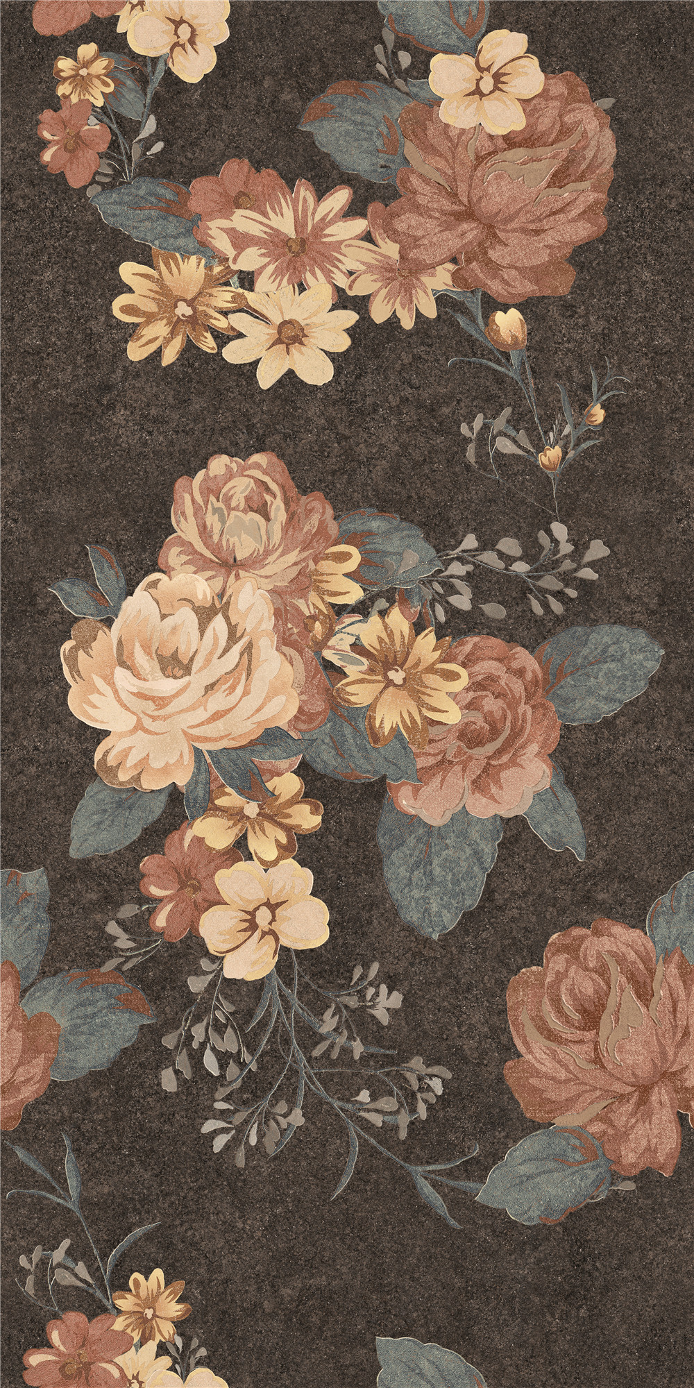 以濃墨般的深邃為底,襯托出復(fù)古牡丹團(tuán)花的雍容綻放。花影層疊,如從舊日錦緞中浮現(xiàn)的紋章,于暗色之上流轉(zhuǎn)著鎏金般的歲月光澤