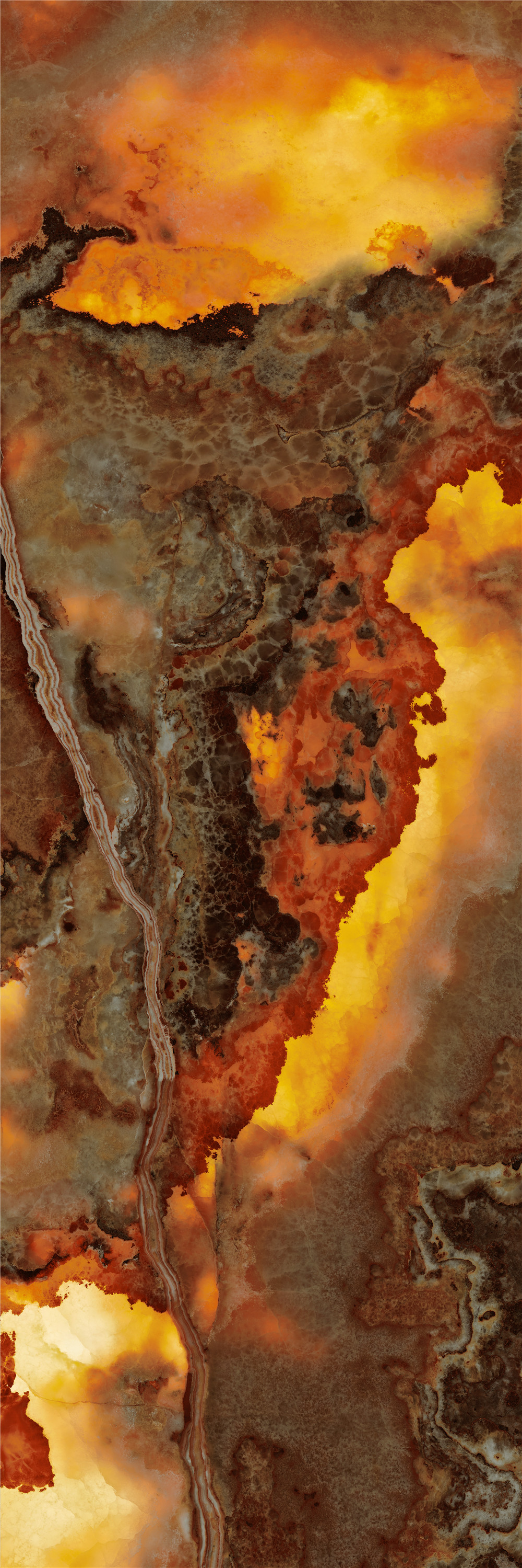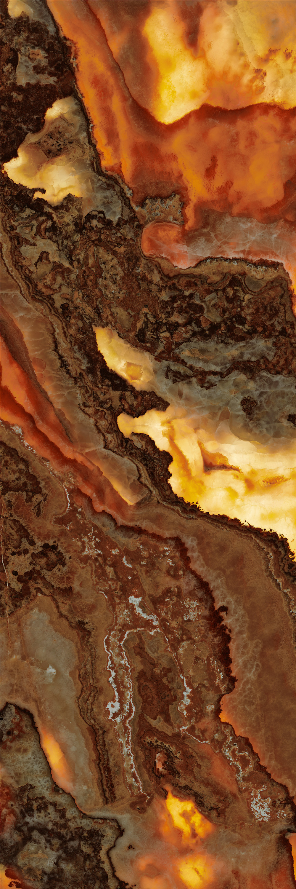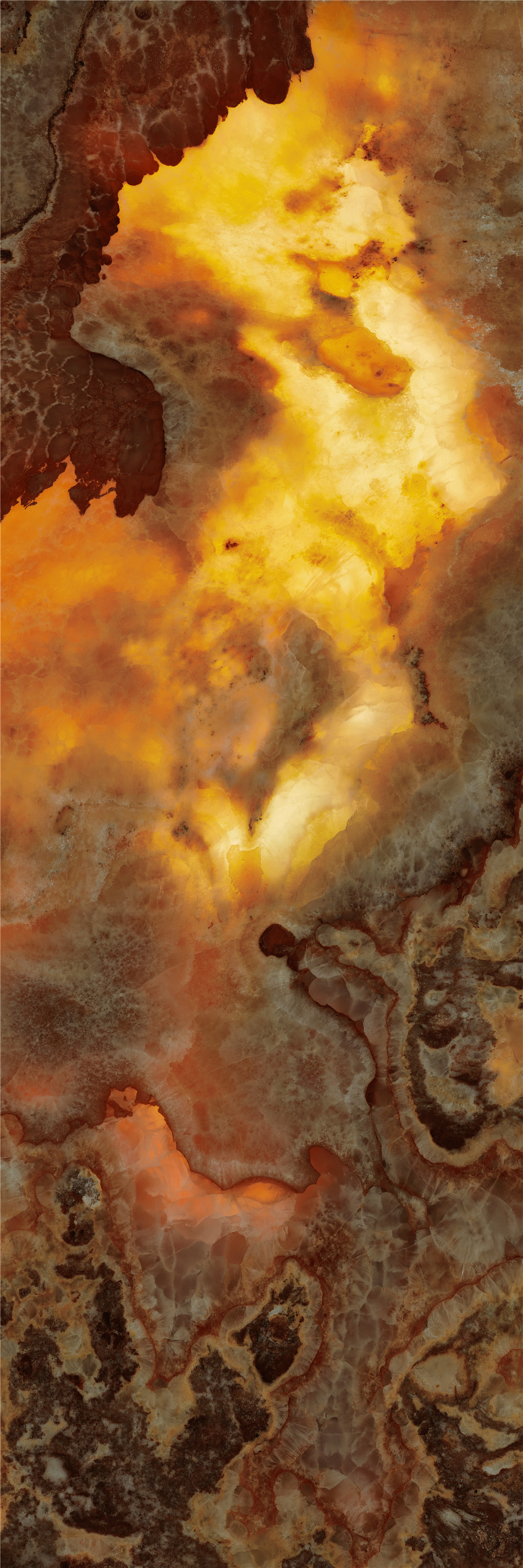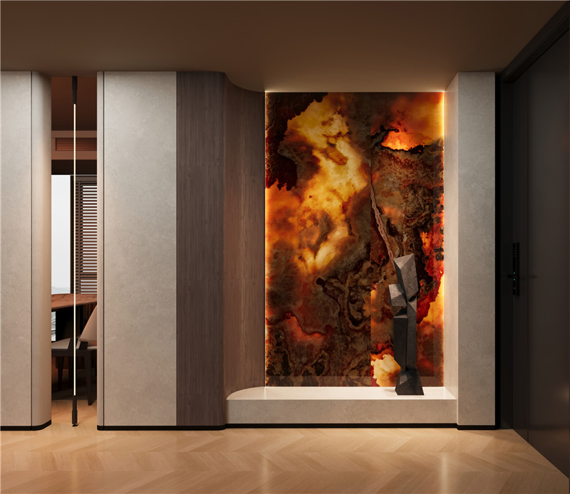 將琥珀的層疊肌理與玉石的溫潤(rùn)透光相融合,在磚面創(chuàng)造出深邃而靈動(dòng)的視覺(jué)縱深。隨著光線流轉(zhuǎn),磚體色澤由暖琥珀漸漸過(guò)渡為淺金,光影在層理間如琉璃般交織疊映,既保留了天然石材的生命脈絡(luò),又為空間鍍上一層靜謐而流動(dòng)的光之詩(shī)。