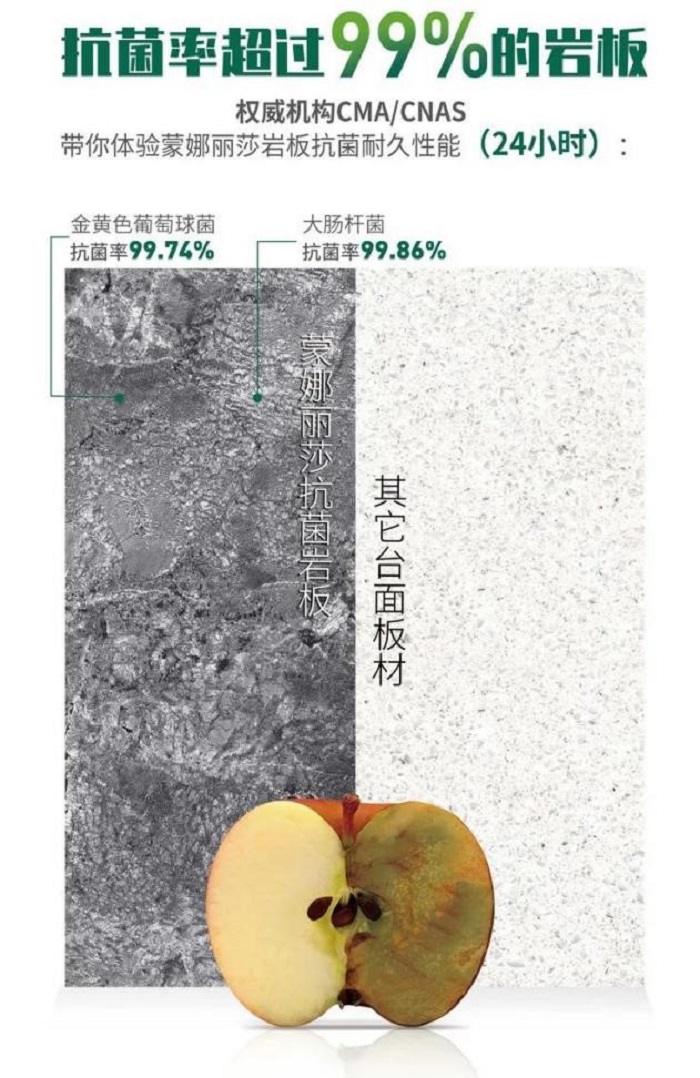 蒙娜麗莎抗菌巖板通過(guò)特殊礦物質(zhì)材料的加入,有效抗菌率(大腸桿菌、金黃色葡萄球菌)最高可達(dá)99%以上。