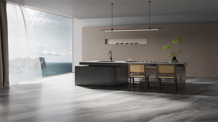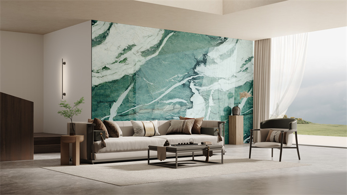 比如 900×2700 mm 巖板之流云蒼翠,為了復(fù)刻出亞馬遜奢石的翠綠色,蒙娜麗莎從選色到確認(rèn),從整體到局部,反復(fù)推敲每一處平衡以及每一個細(xì)節(jié),采用獨創(chuàng)的超晶技術(shù),配合多重凈化熱干燥系統(tǒng)進(jìn)行噴墨施釉,最大限度還原亞馬遜奢石靈動的蒼翠色,以及超晶質(zhì)感如翡翠般深邃,在千變?nèi)f化的光線照耀下,呈現(xiàn)出不同的光感色彩,自帶一種瑩潤的韻味,同時配合富有層次感的自然裂變紋理,體現(xiàn)了靈動的力量之美。