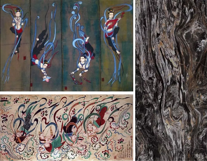 除了完美復刻熔巖流動的狀態(tài),設計師更為其注入文化沉淀,繼承敦煌壁畫的變形手法,通過寥寥數(shù)筆的簡約線條,展現(xiàn)出大氣、靈動的紋理,似飄曳的衣裙、飛舞的彩帶凌空翱翔,姿態(tài)萬千中演繹歷史與文化的魅力,震撼的視覺沖擊力讓人久久不能忘懷。