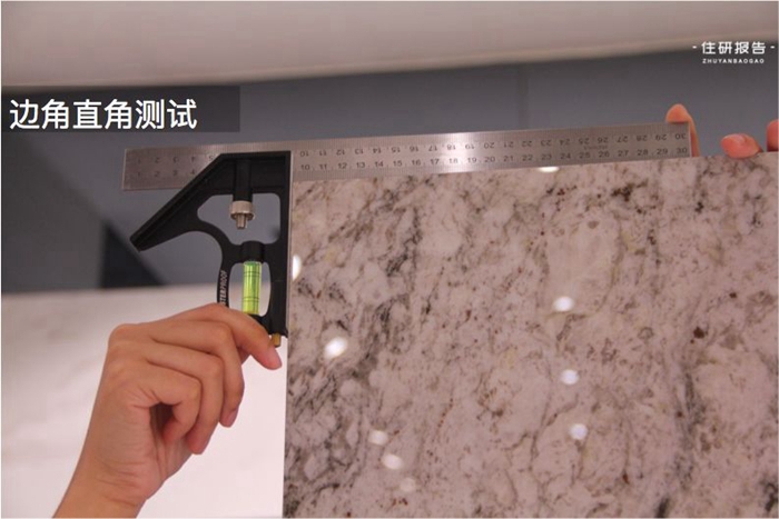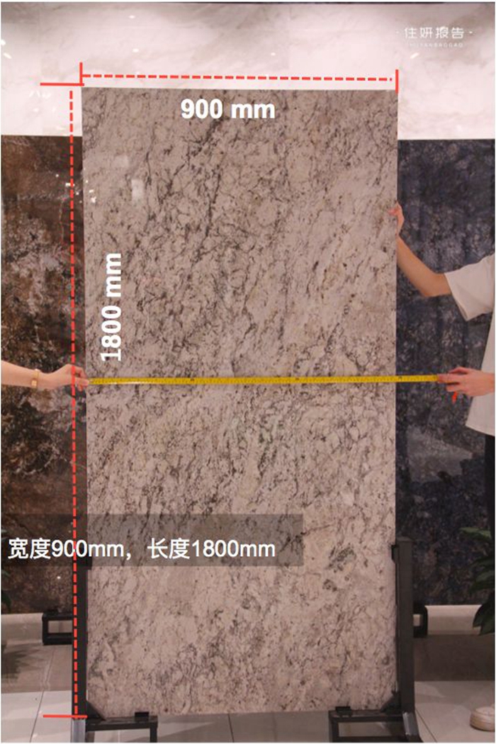 首先是尺寸精準(zhǔn)度測(cè)量,這款瓷磚規(guī)格是900×1800mm,樣板測(cè)量準(zhǔn)確無誤差。