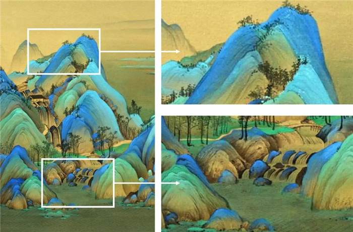 山色用汁綠染出,礦物和植物顏色融合使用, 將中國(guó)畫色彩的表現(xiàn)力發(fā)揮到極致