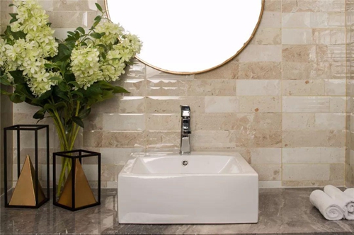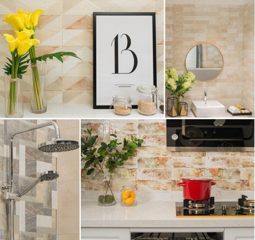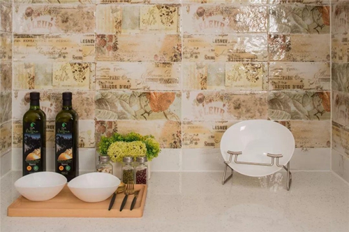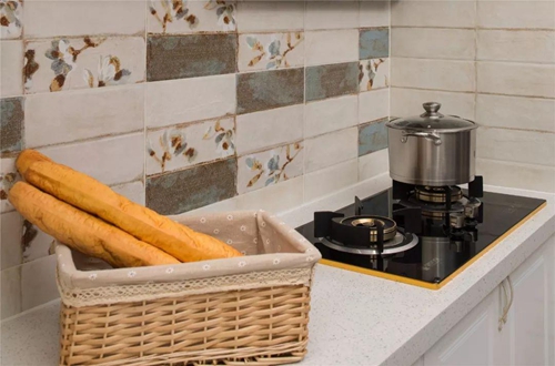 如島臺(tái)里面、油煙機(jī)下部等位置巧妙運(yùn)用花磚,